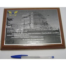 PLACA (14X20 CM) EM AÇO PRATEADO, FIXADO EM BASE DE MADEIRA (17,5X23,5 CM), CONTENDO A GRAVAÇÃO 'CLUBE DOS TAIFEIROS DA AERONÁUTICA / EXCELENTÍSSIMO SENHOR LUIZ IGNÁCIO LULA DA SILVA / DD PRESIDENTE DA REPÚBLICA / NÃO HÁ PALAVRAS QUE POSSAM DIMENSIONAR E EXPRESSAR O SENTIMENTO DE GRATIDÃO QUE FICARÁ MARCADO DE FORMA INDELÉVEL NOS CORAÇÕES DOS INTEGRANTES DO QUADRO DE TAIFEIROS DA AERONÁUTICA.../ PRESIDENTE LULA OS NOSSOS ETERNOS AGRADECIMENTOS A VOSSA EXCELÊNCIA E OS VOTOS DE CONTINUADO SUCESSO EM SUA VIDA PÚBLICA. / DEUS ABENÇOE A VOSSA EXCELÊNCIA E A EXCELENTÍSSIMA FAMÍLIA! / RIO DE JANEIRO, 28 DE DEZEMBRO DE 2009. / ANTONIO TITONELLI / PRESIDENTE'. ACONDICIONADA EM ESTOJO FORRADO DE TECIDO AZUL CLARO.