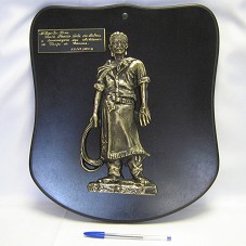 ESCULTURA BIDIMENSIONAL (28,5X12,5 CM) DE UM TAIFEIRO, CONFECCIONADA EM METAL DOURADO E FIXADA EM BASE DE MADEIRA(38X39,5 CM) NA COR PRETA. NA BASE, PEQUENA PLACA EM AÇO (4X12 CM) COM A GRAVAÇÃO 'AO EXMO SR. PRES. / LUIZ INACIO LULA DA SILVA / A HOMENAGEM DOS MILITARES DA TAIFA DE CANOAS. / 28/12/2009'.