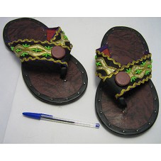 PAR DE SANDÁLIAS DE DEDO (SEM INDICAÇÃO DE NUMERAÇÃO). POSSUI SOLADO EM BORRACHA FORRADO EM NAPA PRETA E MARROM; TIRAS EM TECIDO NA COR PRETA, COM DETALHES EM FITA DOURADA E BORDADO EM MIÇANGAS VERDES. PARTE INTERNA NA COR VERMELHA.