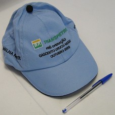 BONÉ EM TECIDO AZUL. NA FRENTE, BORDADA A LOGOMARCA DA TRANSPETRO E A INSCRIÇÃO 'PRÉ-OPERAÇÃO / GASODUTO URUCU-MANAUS / OUTUBRO 2009'. NAS LATERAIS, A INSCRIÇÃO 'MALHA NORTE'.