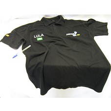 CAMISA GOLA PÓLO (TAM GG) NA COR PRETA. NA FRENTE, BORDADOS A BANDEIRA NACIONAL E A INSCRIÇÃO 'LULA', A LOGOMARCA DA REDETV E A INSCRIÇÃO '10 ANOS / HD'. NA MANGA DIREITA BORDADA A INSCRIÇÃO '10 ANOS / HD'. ATRÁS, '10 ANOS / HD / OPERAÇÕES'.