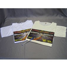 DUAS CAMISETAS (TAM G), UMA EM MALHA BRANCA E OUTRA EM MALHA BEGE. NA FRENTE, ESTAMPA COM FOTOGRAFIA DA RODOVIA MT 206 E A INSCRIÇÃO 'CHEGOU A NOSSA VEZ / RODOVIA DA PRODUÇÃO / PARANAÍTA - ALTA FLORESTA / APOIO ESSA IDEIA / MT 206'. ATRÁS, LOGOMARCA DA ASSOCIAÇÃO NA GESTÃO 2009-2012.