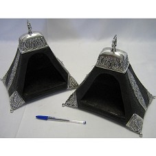 PAR DE ESTRIBO DE CAIXA (24,5X16,5X24,5 CM), PARA APOIO DOS PÉS, CONFECCIONADO EM MADEIRA E COURO, COM DETALHES DE MOTIVOS FLORAIS, EM PRATA 925. POSSUI DESENHOS FLORAIS E GEOMÉTRICOS GRAVADOS NA MADEIRA. ACONDICIONADO EM CAIXA DE PAPELÃO (29,5X42,5X23 CM), FORRADA COM PAPEL DE LISTRAS VERTICAIS NAS CORES VERMELHA, BEGE E VERDE.
