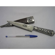 FACA (23,5 CM) COM LÂMINA EM METAL PRATEADO, CONTENDO A GRAVAÇÃO 'TANDIL / EL CHAJA / IND. ARGENTINA'. POSSUI CABO METÁLICO, ORNADO COM MOTIVOS GEOMÉTRICOS; BAINHA (17 CM) CONFECCIONADA EM COURO MARROM COM DETALHES EM METAL. ACONDICIONADA EM CAIXA DE PAPELÃO AZUL (2,5X28,5X5 CM), TENDO, NA PARTE INTERNA, PLACA PRATEADA (2X6 CM) CONTENDO A GRAVAÇÃO 'SEÑORA PRESIDENTA DE LA REPÚBLICA ARGENTINA / DRA. CRISTINA FERNANDEZ DE KIRCHNER'.
