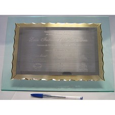 PLACA (19X29 CM) EM AÇO PRATEADO E DOURADO COM BORDAS ONDULADAS, CONTENDO A GRAVAÇÃO 'NOSSA HOMENAGEM E GRATIDÃO AO EXCELENTÍSSIMO SENHOR LUIZ INÁCIO LULA DA SILVA / PATRONO DA 71ª FESTA DAS FLORES DE JOINVILLE. / JOINVILLE, 17 DE NOVEMBRO DE 2009.'. FIXADA EM BASE DE VIDRO (25X35 CM). ACOMPANHA SUPORTE EM METAL PRATEADO. ACONDICIONADA EM CAIXA (28,5X39X7 CM) FORRADA COM TECIDO PRETO COM UMA PEQUENA PLACA CONTENDO A GRAVAÇÃO 'LUIZ INÁCIO LULA DA SILVA', NO CANTO INFERIOR DIREITO.