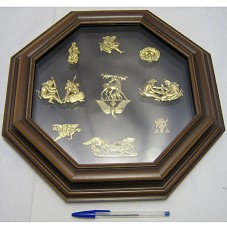 QUADRO (37X37 CM) COM MOLDURA OITAVADA, CONFECCIONADA EM MADEIRA, E TAMPO DE VIDRO. MOLDURA TIPO CAIXOTE, CONTENDO EM SEU INTERIOR, NOVE FIGURAS DOURADAS, DE APARÊNCIA MITOLÓGICA, DISPOSTAS PRÓXIMAS A CADA FACE DA MOLDURA, E A NONA AO CENTRO. NO CANTO INFERIOR DIREITO, UMA MOEDA COM A FIGURA DE UM ANJO GUERREIRO. ACOMPANHA FOLHETO.