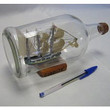 MINIATURA DE CARAVELA (7X13X2 CM) CONFECCIONADA EM MADEIRA, COM VELAS EM TECIDO BEGE. ACONDICIONADA DENTRO DE UMA GARRAFA DE VIDRO (9X9X23 CM). GARRAFA NA POSIÇÃO HORIZONTAL, COLADA EM BASE DE MADEIRA, ONDE HÁ A INSCRIÇÃO 'GUARUJÁ / JAN 2010'.