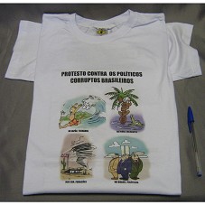 CAMISETA (TAM GG) EM MALHA BRANCA, DE MANGA CURTA. NA FRENTES, ESTAMPA COM QUATRO DESENHOS DIFERENTES, E A INSCRIÇÃO 'PROTESTO CONTRA OS POLÍTICOS CORRUPTOS BRASILEIROS / NO JAPÃO, TSUNAMIS / NA ÍNDIA, ENCHENTES / NOS EUA, FURACÕES / NO BRASIL, POLÍTICOS'. ATRÁS, MESMA ESTAMPA E A INSCRIÇÃO 'O SENHOR DOS PROTESTOS / LEIA O LIVRO / PROTESTO CONTRA OS POLÍTICOS CORRUPTOS BRASILEIROS / WWW.SENHORDOSPROTESTOS.COM.BR'.