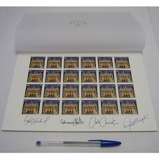SELO COMEMORATIVO AO CENTENÁRIO DO THEATRO MUNICIPAL DO RIO DE JANEIRO. CONJUNTO COMPOSTO POR VINTE E QUATRO SELOS IGUAIS, DISPOSTOS EM QUATRO FILEIRAS E SEIS COLUNAS, FIXADOS EM PAPEL CANSON BEGE, FORMANDO BORDADURA, E COM FOLHA DE PAPEL VEGETAL, CONTENDO O SELO DO THEATRO, COMO CAPA. O SELO POSTAL POSSUI FOTOGRAFIA DA FACHADA DO THEATRO, SOBRE FUNDO AZUL. NA PARTE SUPERIOR ESQUERDA, A INSCRIÇÃO 'BRASIL 2009'; NA DIREITA, '1º PORTE / CARTA COMERCIAL'; NA LATERAL DIREITA, O NOME 'GLÓRIA DIAS'; E NA PARTE INFERIOR, 'CENTENÁRIO DO THEATRO MUNICIPAL DO RIO DE JANEIRO'. EM DOURADO, NO CANTO INFERIOR DIREITO DE CADA SELO, O SELO DO THEATRO. POSSUI, NA BORDA INFERIOR, ASSINATURAS DE SÉRGIO CABRAL, ADRIANA RATTES, CARLA CAMURATI E ROBERTO MINCZUK. ACONDICIONADO EM ENVELOPE ENDEREÇADO AO PRESIDENTE LULA, ASSINADO PELO GOVERNADOR SÉRGIO CABRAL, ADRIANA RATTES E CARLA CAMURATI. ESTE, EM ENVELOPE TIMBRADO DO THEATRO.