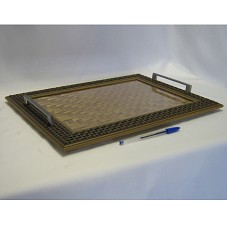 BANDEJA (34X44 CM) COM BORDAS BAIXAS EM MADEIRA TRABALHADA COM MOLDURA TRANÇADA; ALÇAS EM METAL; E TAMPO DE VIDRO. ABAIXO DO VIDRO, TRAMA TRANÇADA EM CAPIM DOURADO.
