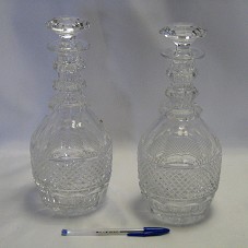 DUAS JARRAS IGUAIS (27,5X12X12 CM, MEDIDAS COM TAMPA), DECANTER PARA VINHO, CONFECCIONADAS EM CRISTAL, COM BOJO TRABALHADO NO ESTILO CASCA DE ABACAXI. ACOMPANHA TAMPA EM MESMO MATERIAL, ENCAIXADA NO GARGALO DA JARRA. ACONDICIONADAS EM CAIXAS DE PAPELÃO BRANCO, COM NOME DO FABRICANTE NA TAMPA.