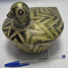 ESCULTURA (14X15 CM), REPRESENTANDO UMA AVE, NAS CORES BEGE E DOURADO E DESENHOS COM MOTIVOS TRIBAIS.