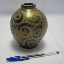 VASO DECORATIVO (13 CM), CONFECCIONADO EM CERÂMICA, PINTADO EXTERNAMENTE EM TONS DE BEGE E DOURADO E DESENHOS COM MOTIVOS TRIBAIS. ACONDICIONADO EM CAIXA DE MATERIAL RECICLADO (20,5X14X14 CM), COM UMA FLOR ARTESANAL NA COR ROSA NA TAMPA.
