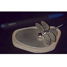 LIBÉLULA (5,5X6 CM) EM PRATA, COM UMA AMETISTA NA CABEÇA, FIXADA EM BASE (10X6,5X1 CM) DE PEDRA-SABÃO, FORMA IRREGULAR, COM PEDAÇO DE METAL ESCOVADO COLADO NA BASE, EM MESMO FORMATO. ACOMPANHA INFORMATIVO SOBRE A PEÇA 'A LIBÉLULA', DE CLÁUDIO QUINDERÉ. ACONDICIONADA EM CAIXA SEXTAVADA, COM TAMPA, FORRADA COM PAPEL ENRUGADO, NA COR CREME.