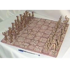 JOGO DE XADREZ, COM PEÇAS EM ARGILA E TABULEIRO EM MADEIRA E ARGILA. AS PEÇAS SÃO FIGURAS REPRESENTANDO OS CANGACEIROS, LAMPIÃO, MARIA BONITA, JEGUE, CACTO, E O PADRE; O TABULEIRO, REPRESENTA O SOLO ÁRIDO DO NORDESTE, A TERRA SECA COM SUAS RACHADURAS. PEÇAS EMBALADAS UMA A UMA, EM PAPEL CELOFANE TRANSPARENTE; E, JOGO ACONDICIONADO EM CAIXA DE PAPELÃO (41X41X6 CM), FORRADA COM PAPEL CRAFT, TENDO ESTAMPADO 'CEART / CENTRO DE ARTESANATO DO CEARÁ', COM SELO DO MESMO NA TAMPA.