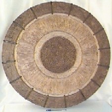 MANDALA (80X80X4 CM), INTITULADA 'MANDALA INDÍGENA', CONFECCIONADA EM MADEIRA, COURO E PALHA, EM TONALIDADES DE MARROM. FORMADA POR CINCO CÍRCULOS CONCÊNTRICOS, SENDO O INTERNO EM PALHA EMASSADA E PINTADA, E, OS DEMAIS, EM MADEIRA PINTADA E TEXTURIZADA. NO CÍRCULO QUE FORMA A MOLDURA, TIRAS DE COURO DISPOSTAS AO LONGO DA CIRCUNFERÊNCIA, FORMANDO RAIOS CONCÊNTRICOS. ACOMPANHA FOLDER 'ESPAÇO PATRÍCIA COSTA / ESCRITÓRIO DE ARTE & DECORAÇÃO'. ASSINADA PELA AUTORA, NA LATERAL, 'PATRÍCIA COSTA', EM DOURADO. ATRÁS, MANUSCRITO 'PATRÍCIA COSTA / FORTALEZA CE/ SETEMBRO 2002' E, UMA ETIQUETA 'ATELIÊ PATRÍCIA COSTA / RUA JORNALISTA NERTAN MACÊDO, 260 - PAPICU / CEP 60.190-730 / FORTALEZA-CEARÁ/BRASIL / TELES: 85*2493374 085-9113.3979'.