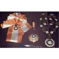 ORDEM DA LIBERDADE (PORTUGAL), NO GRAU DE GRÃ COLAR, COMPOSTO POR: UMA FAIXA (COM LISTRA BRANCA E LARANJA) CONTENDO UMA MEDALHA COM DESENHO DE UMA CRUZ (EM METAL ESMALTADO DE AZUL CLARO) INSCRITA EM UM CÍRCULO COM BORDA AZUL E DOURADA E FUNDO BRANCO, TENDO AO SEU REDOR, MOLDURA COM RAMOS BRANCOS E DETALHES EM DOURADO, E, NA PARTE SUPERIOR DA MEDALHA, UMA COROA DE RAMOS, DE FORMA OVAL, COM UNS RAIOS EM VINHO DENTRO DELA; UM GRANDE COLAR, COM A MESMA MEDALHA COMO PINGENTE E CORDÃO FORMADO POR CÍRCULO BRANCO CONTENDO A CRUZ (EM AZUL CLARO) E COROA DE RAMOS, INTERCALADOS, E, NO CENTRO, UMA MEDALHA EM DOURADO, COM A INSCRIÇÃO 'FREDERICO COSTA / LISBOA / R.S. JULIÃO 110-30'; UMA MEDALHA, COM MESMO SÍMBOLO E ACABAMENTO EM RAIOS DOURADOS AO REDOR; E, UMA PEQUENA INSÍGNIA NUMA FITA COM LISTRAS LARANJA E BRANCA. ACONDICIONADO EM CAIXA DE MADEIRA (40,5X24X4 CM) FORRADA COM NAPA AZUL MARINHO, TENDO NA TAMPA O BRASÃO DE PORTUGAL E 'R.P.' EM DOURADO.