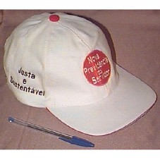 BONÉ EM TECIDO BRANCO. NA FRENTE, BORDADO, UM CÍRCULO VERMELHO COM INSCRIÇÃO EM BRANCO 'NOVA PREVIDÊNCIA DO SERVIDOR'; NAS LATERAIS, BORDADO EM PRETO, 'JUSTA E SUSTENTÁVEL'.
