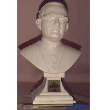BUSTO (16,5X16X8 CM) EM MÁRMORE BRANCO, COM BASE/PEDESTAL (9X10X7,5 CM) NO MESMO MATERIAL. ROSTO DE UM HOMEM, USANDO ÓCULOS, CHAPÉU DE PADRE, BATINA E CORDÃO. NA BASE, UMA PLACA (3X3 CM) EM METAL DOURADO, COM A INSCRIÇÃO 'SAN ROMERO DE AMERICA / EL SALVADOR, CENTRO AMERICA RECUERDO DEL FMLN'. EM UMA DAS LATERAIS, A INSCRIÇÃO 'R. MONTÚ - AR D.'. FUNDO DA BASE EM VELUDO VINHO.