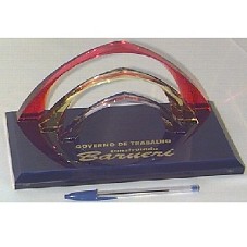 ESCULTURA EM ACRÍLICO FORMADA POR TRÊS ARCOS (9X22X1,5 CM; 7X18X1,5 CM; E, 5X14X1,5 CM) NAS CORES VERMELHO, AMARELO E AZUL, DISPOSTOS UM NA FRENTE DO OUTRO, EM ORDEM CRESCENTE; FIXADOS EM BASE ACRÍLICA (14X25,5X2 CM) NA COR AZUL MARINHO, COM INSCRIÇÃO EM AMARELO 'GOVERNO DE TRABALHO / CONSTRUINDO BARUERI'.