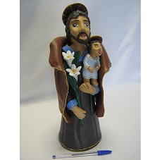 ESCULTURA (36 CM) EM ARGILA, IMAGEM DE SÃO JOSÉ SEGURANDO O MENINO JESUS NO BRAÇO ESQUERDO, E UM RAMO DE FLORES BRANCAS NO DIREITO. NA PARTE POSTERIOR DA BASE, A INSCRIÇÃO 'NEWTON'.