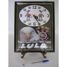 RELÓGIO DE PAREDE (31X24 CM) COM MOLDURA PRETA, TENDO COMO FUNDO DESENHO DE UM GAVIÃO, O EMBLEMA DO CORÍNTHIANS, E A INSCRIÇÃO 'TIMÃO / ... / TIMÃO / LULA'. ACOMPANHA CARTÃO DE VISITA DO AGENTE, TENDO NO REVERSO A INSCRIÇÃO 'OLÁ LULA, EU SOU DELY, EX METALÚRGICO E HOJE FUNCIONÁRIO DA UNICAMP. ESPERO QUE RECEBA ESTA LEMBRANÇA. ABRAÇOS', E PAPEL COM INSTRUÇÕES DE USO E MANUSEIO. ACONDICIONADO EM CAIXA DE PAPELÃO.
