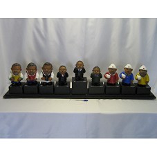 CONJUNTO DE NOVE ESCULTURAS EM CERÂMICA REPRESENTANDO O PRESIDENTE LULA EM DIFERENTES MOMENTOS. EM TRÊS DELAS (18,5 CM CADA) MOSTRA O PRESIDENTE COM CAMISA BRANCA, COLETE (AZUL, AMARELO E VERMELHO) E CALÇA (AZUL E BRANCA), COM ESTRELA DO 'PT' NA GOLA DA CAMISA. OUTRAS TRÊS (16,5 CM CADA) MOSTRA O PRESIDENTE COM AS MÃOS CRUZADAS NAS COSTAS, OS OLHOS FECHADOS, VESTINDO TERNO COM BROCHE DA BANDEIRA BRASILEIRA NA LAPELA (CADA UM COM TERNO DE DIFERENTE COR: AZUL MARINHO, PRETO E VERDE). AS TRÊS ÚLTIMAS (17,5 CM CADA), COM O PRESIDENTE VESTINDO UMA TÚNICA (AMARELA, AZUL E VERMELHA), COM GORRO BRANCO, SEGURANDO O QUE PARECE SER UMA 'LÂMPADA' BRANCA. NA PARTE INFERIOR DE CADA UMA, A GRAVAÇÃO 'CORES DA TERRA'. ACOMPANHA AS ESCULTURA, BASE ESCALONADA (2,5X19,5X132,5 CM) DE MADEIRA PINTADA DE PRETO, ONDE HÁ NOVE CUBOS COLADOS, CADA UM CONTENDO UMA PLACA METÁLICA COM GRAVAÇÃO DO TÍTULO DE CADA ESCULTURA. AS MESMAS SÃO COLOCADAS EM CIMA DE CADA CUBO. NAS PLACAS, AS INCRIÇÕES 'COPA 2010', 'O CARA', 'CONSERTANDO O PAÍS', 'O POVO NO PODER', 'O PRESIDENTE', 'TORCENDO PARA O POVO', 'MINHA CASA MINHA VIDA', 'O NORDESTINO' E 'LUZ PARA TODOS'. ESCULTURAS ACONDICIONADAS EM CAIXA DE PAPELÃO BRANCO.