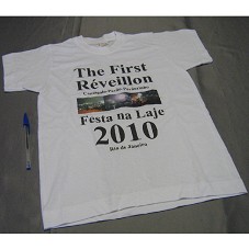 CAMISETA INFANTIL (TAM 10) EM MALHA BRANCA, DE MANGA CURTA. NA FRENTE, ESTAMPA COM TRÊS FOTOGRAFIAS MOSTRANDO ESTOURO DE FOGOS DE ARTIFÍCIO E A INSCRIÇÃO 'THE FIRST RÉVEILLON / CANTAGALO-PAVÃO-PAVÃOZINHO / FESTA NA LAJE 2010 / RIO DE JANEIRO'.