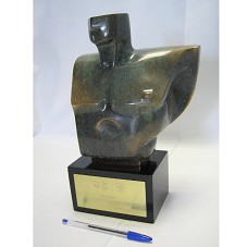 TROFÉU PERSONALIDADE OLÍMPICA 2009. ESCULTURA (22,5X19,5X10 CM) REPRESENTANDO UM BUSTO MASCULINO. NA LATERAL, ASSINATURA DA ARTISTA 'ROSA SERRA'. FIXADA EM BASE (8X14X10 CM) DE MADEIRA, LAQUEADA NA COR PRETA, ONDE HÁ, NA PARTE FRONTAL, PLACA METÁLICA CONTENDO A INSCRIÇÃO 'PRESIDENTE LUIZ INÁCIO LULA DA SILVA / PERSONALIDADE OLÍMPICA 2009'. HÁ AINDA LOGOMARCA DO 'PRÊMIO BRASIL OLÍMPICO 2009' E DO COMITÊ OLÍMPICO BRASILEIRO.