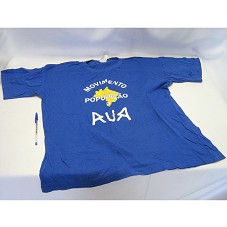 CAMISETA (TAM G) EM MALHA AZUL, DE MANGA CURTA. NA FRENTE, ESTAMPA COM DESENHO DO MAPA DO BRASIL, NA COR AMARELA, E A INSCRIÇÃO 'MOVIMENTO POPULAÇÃO DE RUA'.