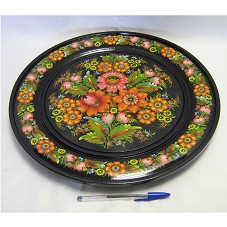 PRATO DECORATIVO / CENTRO DE MESA (40X40 CM) DE FORMATO CIRCULAR, COM BORDAS ELEVADAS, CONFECCIONADO EM MADEIRA. POSSUI FUNDO PINTADO NA COR PRETA. NA BORDA E AO CENTRO, DESENHOS DE FLORES E FOLHAS PINTADOS EM TONS COLORIDOS, SOBRESSAINDO O LARANJA E VERMELHO. NO FUNDO, A INSCRIÇÃO EM UCRANIANO. ACONDICIONADO EM CAIXA FORRADA DE PAPEL BEGE COM LISTRAS EM TONS DE MARROM.