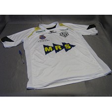 CAMISA DE FUTEBOL DO TIME 'TUPI FUTEBOL CLUBE', NA COR BRANCA, COM DETALHES EM PRETO E DOURADO. POSSUI BRASÃO DO TIME E DA PREFEITURA DE JUIZ DE FORA. ATRÁS, A INSCRIÇÃO 'JUIZ DE FORA / PREFEITURA' E O NÚMERO '10'. CAMISETA COM ASPECTO DE USADA, COM ALGUMAS COSTURAS SOLTANDO E UM DESFIADO PRÓXIMO À GOLA.