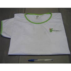 CAMISETA (TAM XGG) EM MALHA BRANCA, DE MANGA CURTA, COM DETALHES EM VERDE. NA FRENTE E ATRÁS, LOGOMARCA DO 'INSTITUTO FEDERAL DE EDUCAÇÃO, CIÊNCIA E TECNOLOGIA / NORTE DE MINAS GERAIS / CAMPUS ARAÇUAI'.