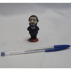 ESCULTURA (6 CM) REPRESENTANDO O PRESIDENTE LULA, CARICATURADO, VESTIDO DE TERNO AZUL MARINHO, COM BROCHE DO PT NA LAPELA. PRESIDENTE ESTÁ EM PÉ, COM AS MÃOS PARA TRÁS, FIXADO EM BASE VERMELHA.