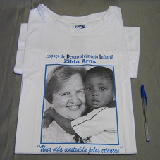 CAMISETA (TAM G) EM MALHA BRANCA, DE MANGA CURTA. NA FRENTE, FOTOGRAFIA DE ZILDA ARNS ABRAÇADA A UMA CRIANÇA, E A INSCRIÇÃO 'ESPAÇO DE DESENVOLVIMENTO INFANTIL ZILDA ARNS / UMA VIDA CONSTRUÍDA PELAS CRIANÇAS'.
