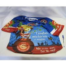 CAMISETA (TAM G) EM MALHA TODA COLORIDA E ESTAMPADA, DE MANGA CURTA. POSSUI ESTAMPA DE FUNDO AZUL MOSTRANDO DESENHO DE UMA BRUXA MEXENDO UM CALDEIRÃO, E A INSCRIÇÃO 'LENDAS, MISTÉRIOS E MAGIAS. NÃO CREIO, MAS... SEI LÁ, NÉ'. NO CALDEIRÃO, EMBLEMA DA 'G.R.E.S. UNIÃO DO PARQUE CURICICA'. NA LATERAL ESQUERDA SUPERIOR, IMAGEM DE SÃO JORGE INSCRITA NUM CÍRCULO, COM A INSCRIÇÃO 'SALVE SÃO JORGE / CURICICA'.