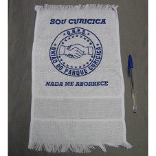 TOALHA DE MÃO (36X23 CM, NA COR BRANCA, COM FRANJA. POSSUI ESTAMPA EM AZUL COM EMBLEMA DA 'G.R.E.S. UNIÃO DO PARQUE CURICICA', E A INSCRIÇÃO 'SOU CURICICA / NADA ME ABORRECE'.