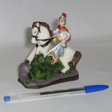 ESCULTURA (10,5X9X4,5 CM) CONFECCIONADA EM RESINA. IMAGEM DE SÃO JORGE MONTADO EM SEU CAVALO, SOBRE O DRAGÃO.