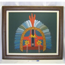 QUADRO (71,5X81,5 CM) COM MOLDURA EM MADEIRA E PASSE-PARTOUT CLARO. EMOLDURA PINTURA SOBRE TELA (55X64,5 CM), COM FUNDO VERDE ESCURO, RETRATANDO UM COCAR INDÍGENA EMOLDURANDO OUTROS DESENHOS. NA PARTE POSTERIOR, A INSCRIÇÃO 'EXCLUSIVO PARA LULA / NETO'.