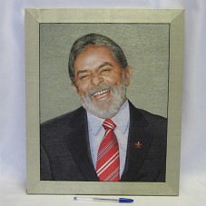 QUADRO (46,5X39 CM) COM MOLDURA EM MADEIRA FORRADA DE TECIDO ESVERDEADO. EMOLDURA PINTURA SOBRE SEDA, TRABALHADA COM BORDADO EM LINHA DE MESMO MATERIAL, RETRATANDO O PRESIDENTE LULA, EM PLANO AMERICANO, SORRINDO. POSSUI FUNDO ESVERDEADO.