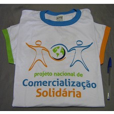 CAMISETA (TAM G) EM MALHA BRANCA, DE MANGA CURTA, COM DETALHES EM AZUL, VERDE E LARANJA, NAS MANGAS E NA GOLA. NA FRENTE, ESTAMPA COM LOGOMARCA DO 'PROJETO NACIONAL DE COMERCIALIZAÇÃO SOLIDÁRIA'.ATRÁS, LOGOMARCAS DE INSTITUIÇÕES PRIVADAS E GOVERNAMENTAIS.