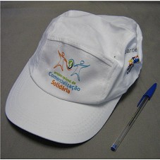 BONÉ EM TECIDO BRANCO. NA FRENTE, ESTAMPA COM LOGOMARCA DO 'PROJETO NACIONAL DE COMERCIALIZAÇÃO SOLIDÁRIA'. NAS LATERAIS, LOGOMARCAS DE INSTITUIÇÕES PRIVADAS E GOVERNAMENTAIS.