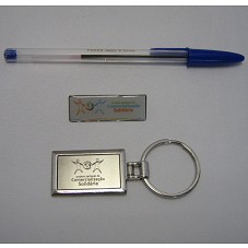 CHAVEIRO (8 CM) EM METAL PRATEADO, COM ESTAMPA DA LOGOMARCA DO 'PROJETO NACIONAL DE COMERCIALIZAÇÃO SOLIDÁRIA'. ACOMPANHA BÓTON RETANGULAR (15X45 MM) EM METAL, COM MESMA ESTAMPA. ACONDICIONADOS EM EMBALAGEM DE PAPELÃO PRETO.