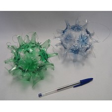 DUAS ESFERAS (13X13 E 12X12 CM) CONFECCIONADAS A PARTIR DA BASE DE GARRAFA PET, COM VÁRIAS PONTAS, FORMANDO ESTRELA. UMA NA COR VERDE; OUTRA, AZUL. ACONDICIONADAS EM SACO PLÁSTICO.
