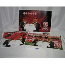 TRÊS CARTAZES (33X47,5 CM CADA) CONTENDO UMA FOTOMONTAGEM DO PRESIDENTE LULA AO LADO DE UM HOMEM, AMBOS SEGURANDO UMA CAMISA DO TIME AUTOGRAFADA. DOIS DOS CARTAZES POSSUEM DESENHO COM EVOLUÇÃO DO BRASÃO; E TODOS O BRASÃO OFICIAL, E FOTOGRAFIA DOS TROFÉUS GANHOS. O PRIMEIRO POSSUI FUNDO VERMELHO E A INSCRIÇÃO 'PRESIDENTE LULA / CAMPEÃO DO MUNDO'; O SEGUNDO, UM ESTÁDIO CHEIO DE TORCEDORES E MESMA INSCRIÇÃO; O TERCEIRO, A BANDEIRA DO TIME E MESMA INSCRIÇÃO.