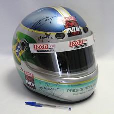 CAPACETE DE FÓRMULA INDI, NA COR PRATEADA, COM DETALHES NAS CORES DA BANDEIRA BRASILEIRA. NA FRENTE, ETIQUETA VERMELHA E PRETA, COM A INSCRIÇÃO 'SÃO PAULO / INDY 300'; NO VIZOR, 'IZOD / FORMULA INDY'. PRÓXIMO À PARTE DO QUEIXO, 'PRESIDENTE LULA / PILOTANDO O BRASIL'. POSSUI AUTÓGRAFOS DOS PILOTOS DE FÓRMULA INDY E DESENHO DA BANDEIRA BRASILEIRA. ACONDICIONADO EM SACOLA DE TECIDO PRETO, COM BRASÃO 'SID / SPECIAL PAINT' BORDADO.