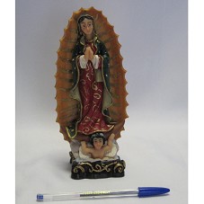 IMAGEM DE NOSSA SENHORA DE GUADALUPE. ESCULTURA EM RESINA (20 CM), MOSTRANDO A SANTA COM MANTO VERMELHO E VÉU VERDE, COM AS MÃOS EM ORAÇÃO. ACONDICIONADA EM CAIXA DE PAPELÃO VERMELHO, CONTENDO A INSCRIÇÃO 'DOMINUM'.