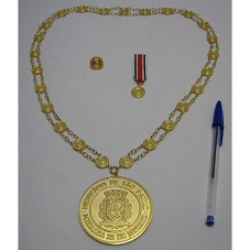 MEDALHA 25 DE JANEIRO, COMEMORATIVA AOS 456 ANOS DO ANIVERSÁRIO DA CIDADE DE SÃO PAULO. MEDALHA (70 MM) CONFECCIONADA EM METAL DOURADO, TENDO NO ANVERSO, BRASÃO DO MUNICÍPIO, CIRCUNDADO PELA INSCRIÇÃO 'MUNICÍPIO DE SÃO PAULO / MEDALHA 25 DE JANEIRO'. NO REVERSO, TEXTO GRAVADO 'MEDALHA ENTREGUE AO EXCELENTÍSSIMO SENHOR LUIZ INÁCIO LULA DA SILVA / PRESIDENTE DA REPÚBLICA / EM SOLENIDADE REALIZADA EM 25 DE JANEIRO DE 2010'. MEDALHA PRESA EM CORDÃO DE MESMO MATERIAL, COMPOSTO POR CORRENTES E MINIATURAS DA MEDALHA. ACOMPANHA BÓTON (15 MM) EM MINIATURA DA MEDALHA; E FITA EM GORGURÃO BRANCO, COM LISTRA CENTRAL NA COR VERMELHA, E DUAS LISTRAS LATERAIS AZUIS, COM PENDENTE DA MINIATURA DA MEDALHA. ACONDICIONADA EM ESTOJO FORRADO DE VELUDO VERMELHO, ONDE HÁ PLACA METÁLICA COM MESMO TEXTO GRAVADO NA INSÍGNIA. NA TAMPA, BRASÃO DO MUNICÍPIO.