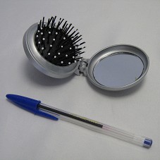 ESCOVA E ESPELHO (65 MM) RETRÁTIL, DE FORMATO CIRCULAR. AO ABRIR A PEÇA, ESPELHO DE UM LADO DA TAMPA, E ESCOVA DO OUTRO. NA TAMPA EXTERNA, ESTAMPA COM NOME E LOGOMARCA DO 'SINDICATO DOS METALÚRGICOS / SOROCABA E REGIÃO', E ENDEREÇO.