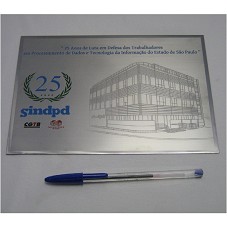 PLACA (14,7X20,8 CM) EM METAL PRATEADO. POSSUI O DESENHO DA PERSPECTIVA DO EDIFÍCIO DA NOVA SEDE DO 'SINDPD' GRAVADO, E A INSCRIÇÃO '25 ANOS DE LUTA EM DEFESA DOS TRABALHADORES EM PROCESSAMENTO DE DADOS E TECNOLOGIA DA INFORMAÇÃO DO ESTADO DE SÃO PAULO'. NA LATERAL, LOGOMARCA DOS VINTE E CINCO ANOS, DO SINDICATO, E OUTRAS. ACONDICIONADA EM ESTOJO FORRADO DE VELUDO AZUL.